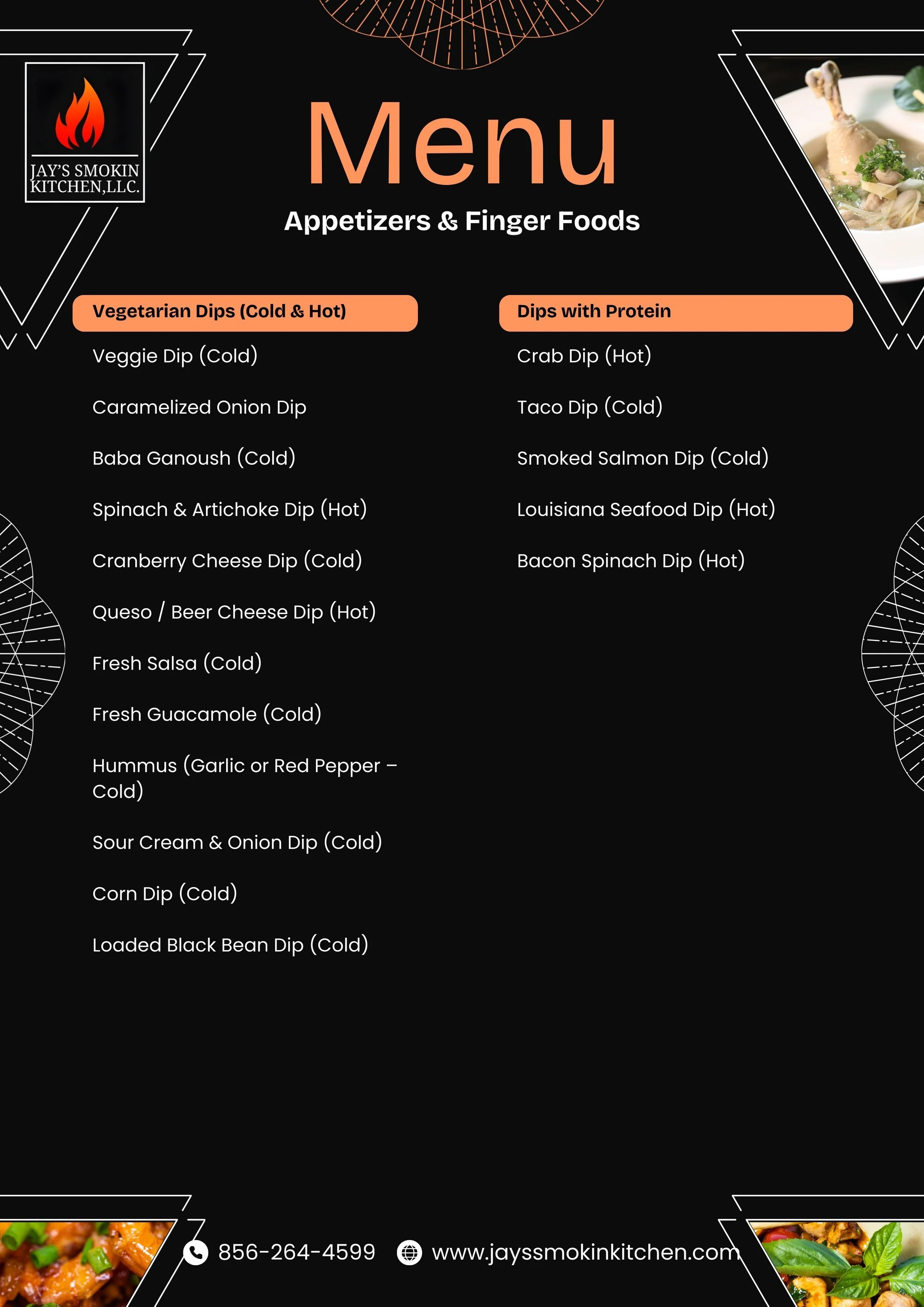 All dips and appetizers are served with appropriate pairing sources, breads, tortilla chips or vegetables.